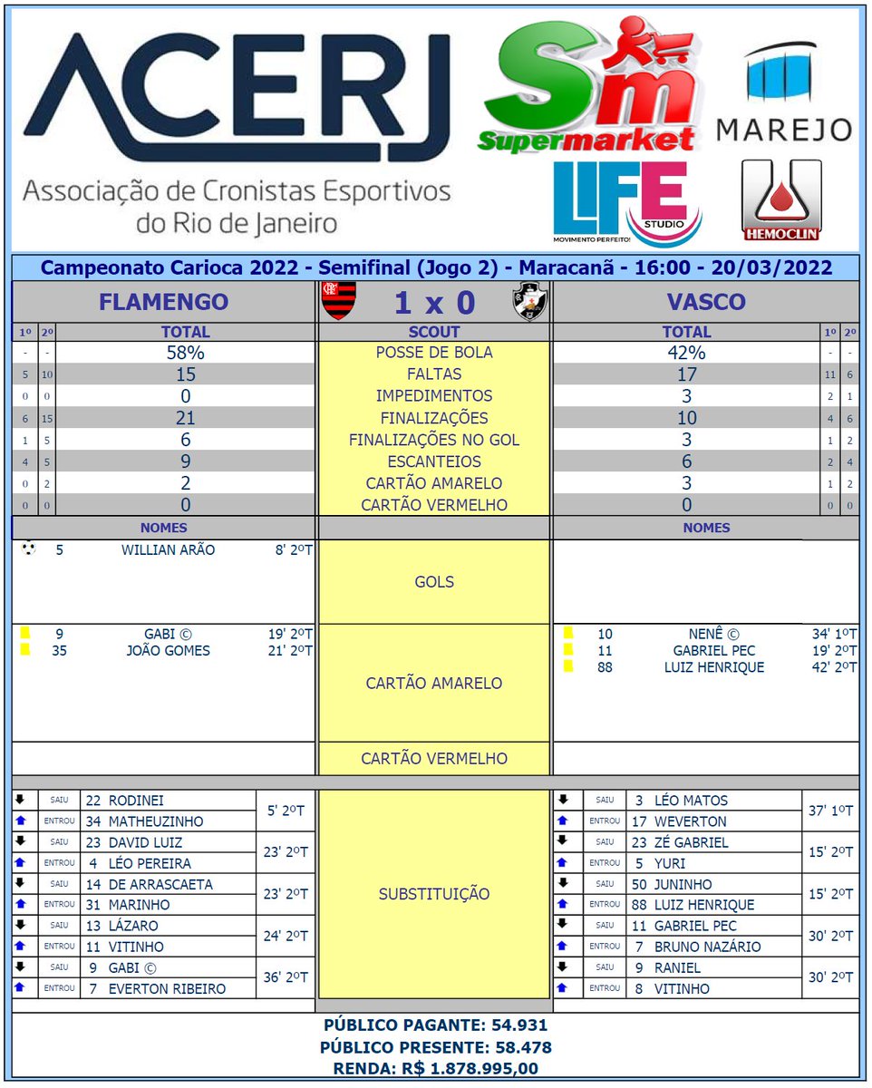 Cartão amarelo: Nenê, Gabriel Pec e Luiz Henrique (Vasco) e Gabigol e João Gomes (Flamengo)