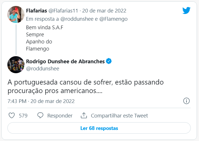 Além de ser um discurso xenófobo, o dirigente do Flamengo, pelo visto, esqueceu que o atual treinador da equipe rubro-negra, Paulo Sousa, é português. A reposta de Rodrigo Dunshee foi tão infeliz que os próprios torcedores do Fla estão criticando a postagem.