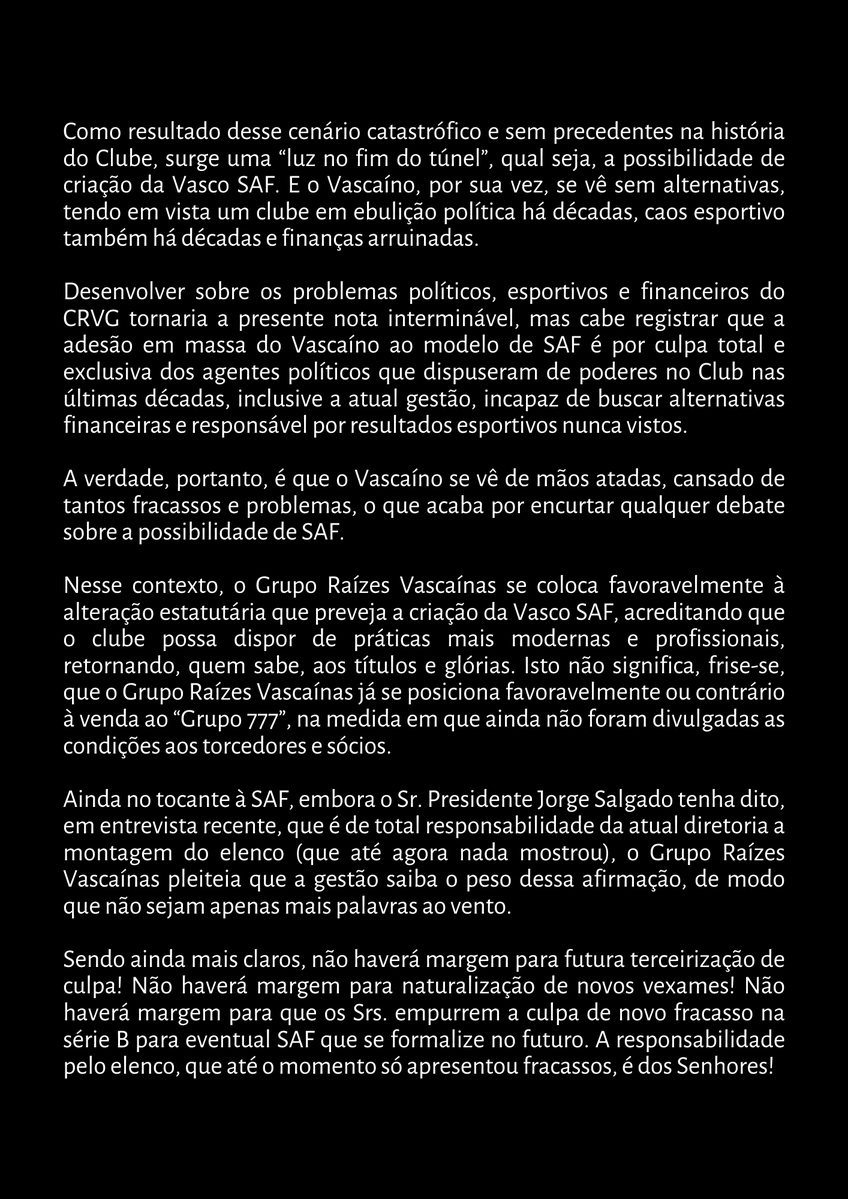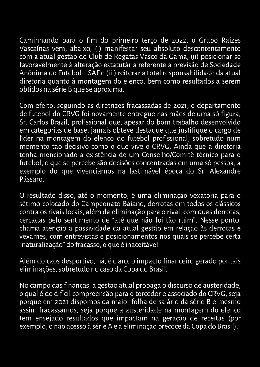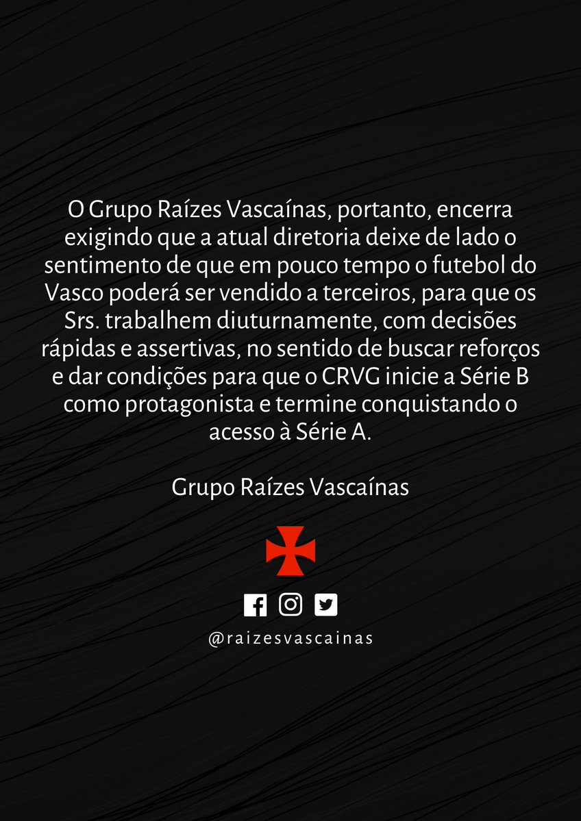 Raízes Vascaínas divulga nota com críticas à diretoria do Vasco