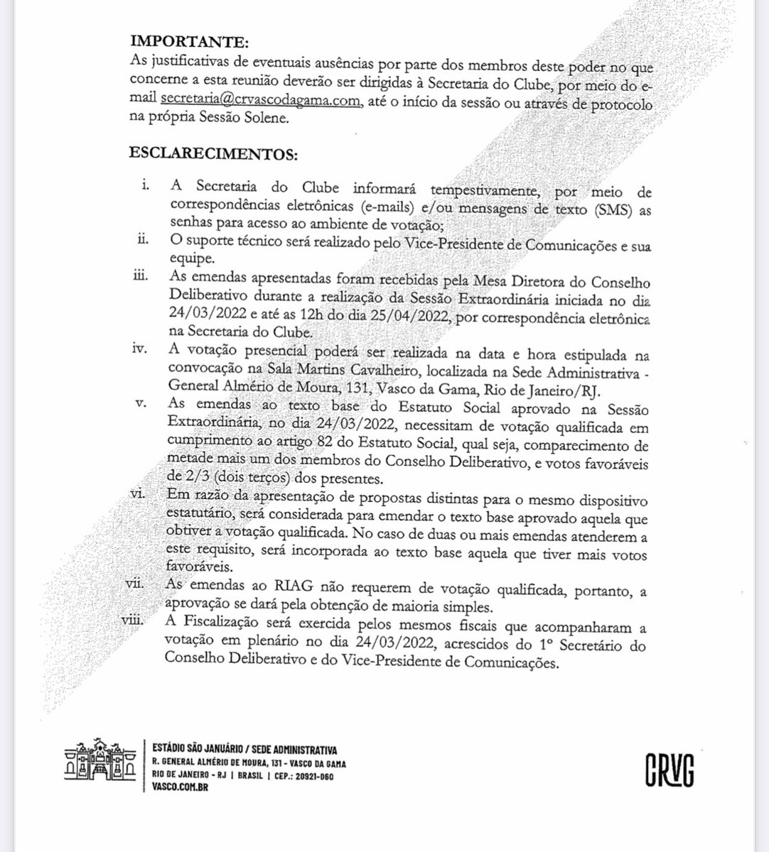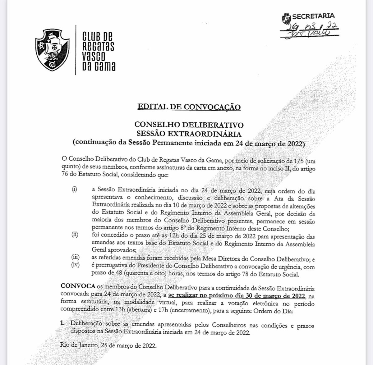 Presidente do Conselho Deliberativo convoca sessão para o dia 30 de março, visando deliberar sobre as emendas apresentadas na última reunião.