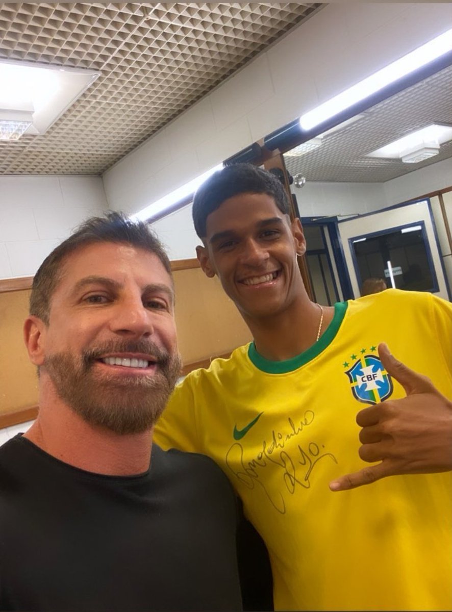 Pedrinho posa para foto com Iran 'Luva de Pedreiro', que participou do 'Esporte Espetacular'