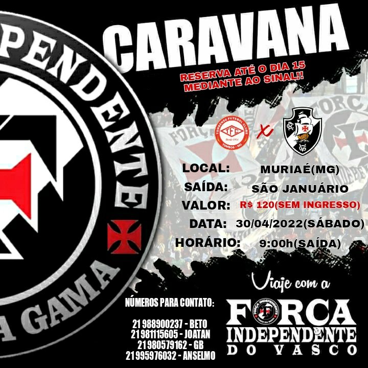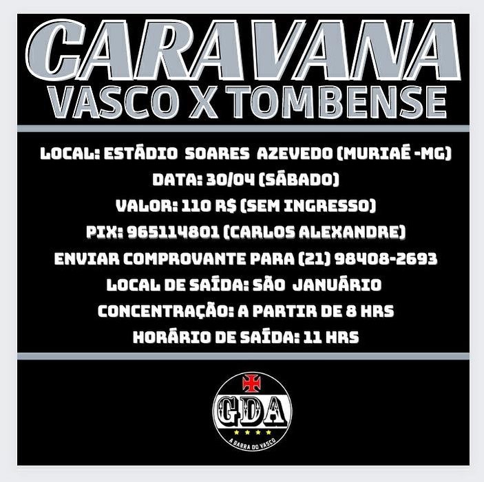 Força Independente e GDA anunciam caravana para Tombense x Vasco, no dia 30/04, em Muriaé
