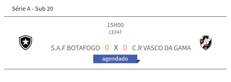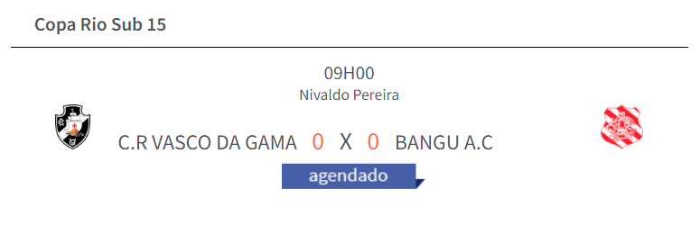 O Vasco tem 3 jogos programados pelas suas categorias de base neste sábado: às 9h, contra o Bangu, pela Copa Rio Sub-15, no Nivaldo Pereira; às 11h, contra o mesmo adversário, no mesmo local, pela Copa Rio Sub-17; e às 15h, contra o Botafogo (S.A.F. Botafogo, na denominação dada pela FFERJ), no Cefat, pela Taça Guanabara Sub-20. Até o momento, nenhum dos clubes envolvidos anunciou transmissão.