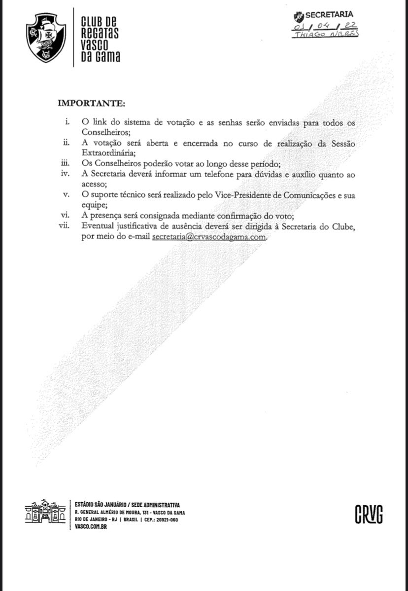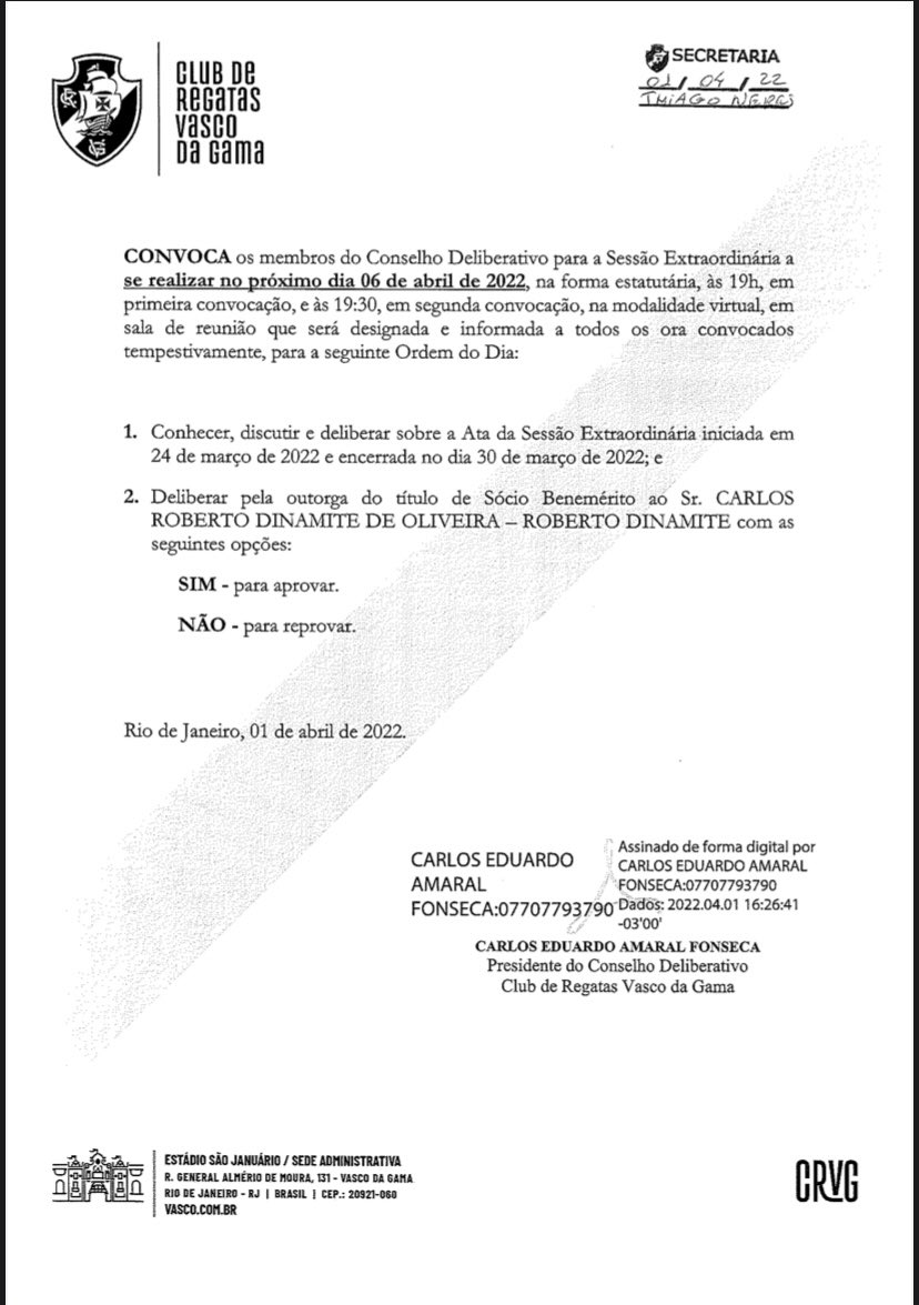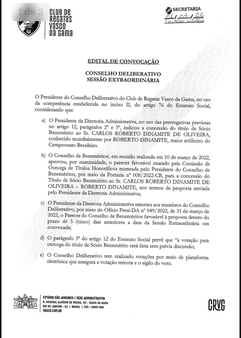 Está marcada para o dia 6 de abril, às 19h (segunda chamada às 19h30) a reunião extraordinária do Conselho Deliberativo do Vasco para aprovar o título de Sócio Benemérito de Roberto Dinamite. Veja o documento: