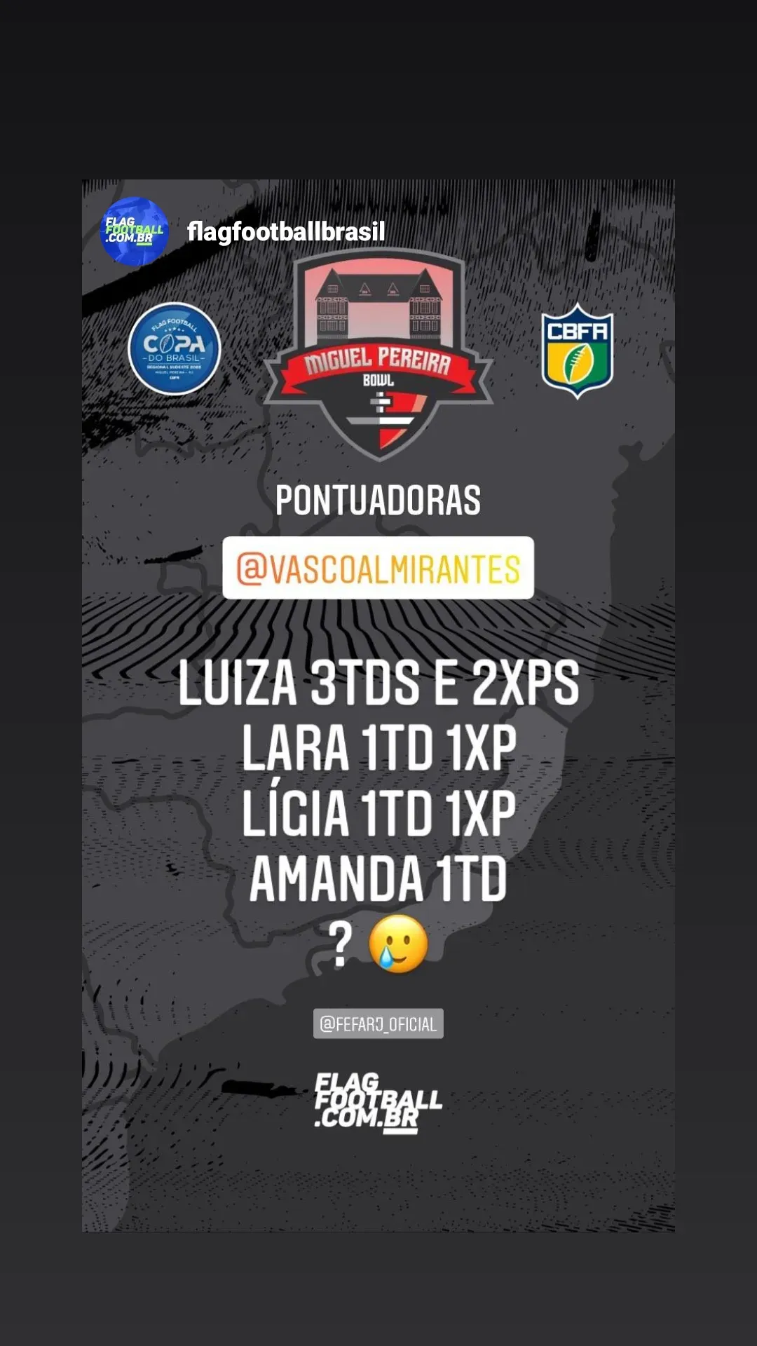 Fim do segundo jogo do dia pela regional sudeste da Copa do Brasil de Flag: Vasco Almirantes 46x0 Tritões-ES