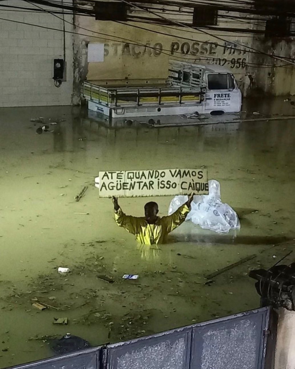 Com água acima da cintura, Caíque faz protesto durante enchente em Nova Iguaçu