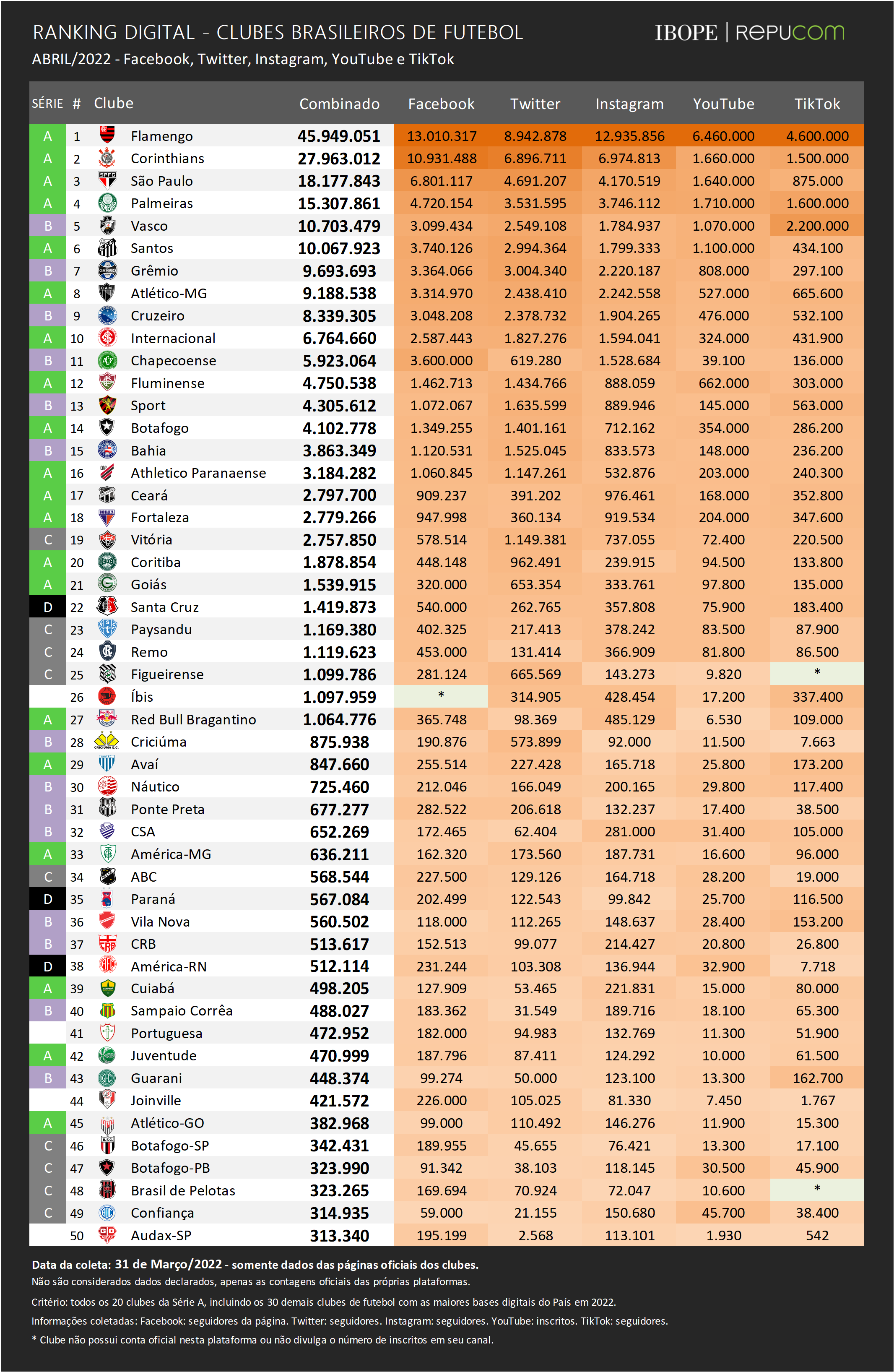 O levantamento é divulgado mensalmente pelo IBOPE Repucom e tem o objetivo de acompanhar o desenvolvimento das bases digitais dos 50 clubes com o maior número de seguidores do país.