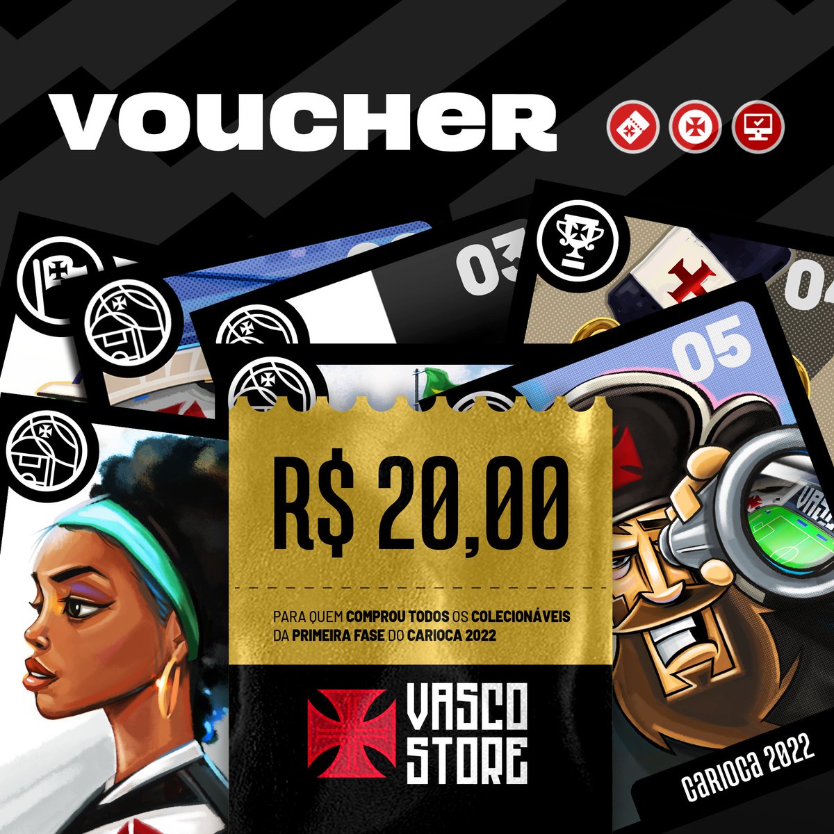 Para quem realizou a compra de todos os Colecionáveis Digitais da primeira fase do Campeonato Carioca 2022, está disponível um voucher de R$20,00 para compra de camisas oficiais na Vasco Store!
