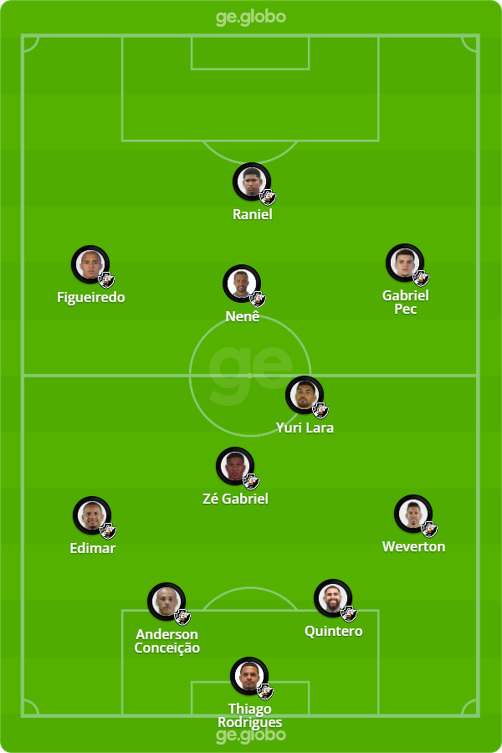 Provável escalação do Vasco: Thiago Rodrigues, Weverton, Quintero, Anderson Conceição, Edimar, Zé Gabriel, Yuri Lara, Nenê, Gabriel Pec, Figueiredo e Raniel.