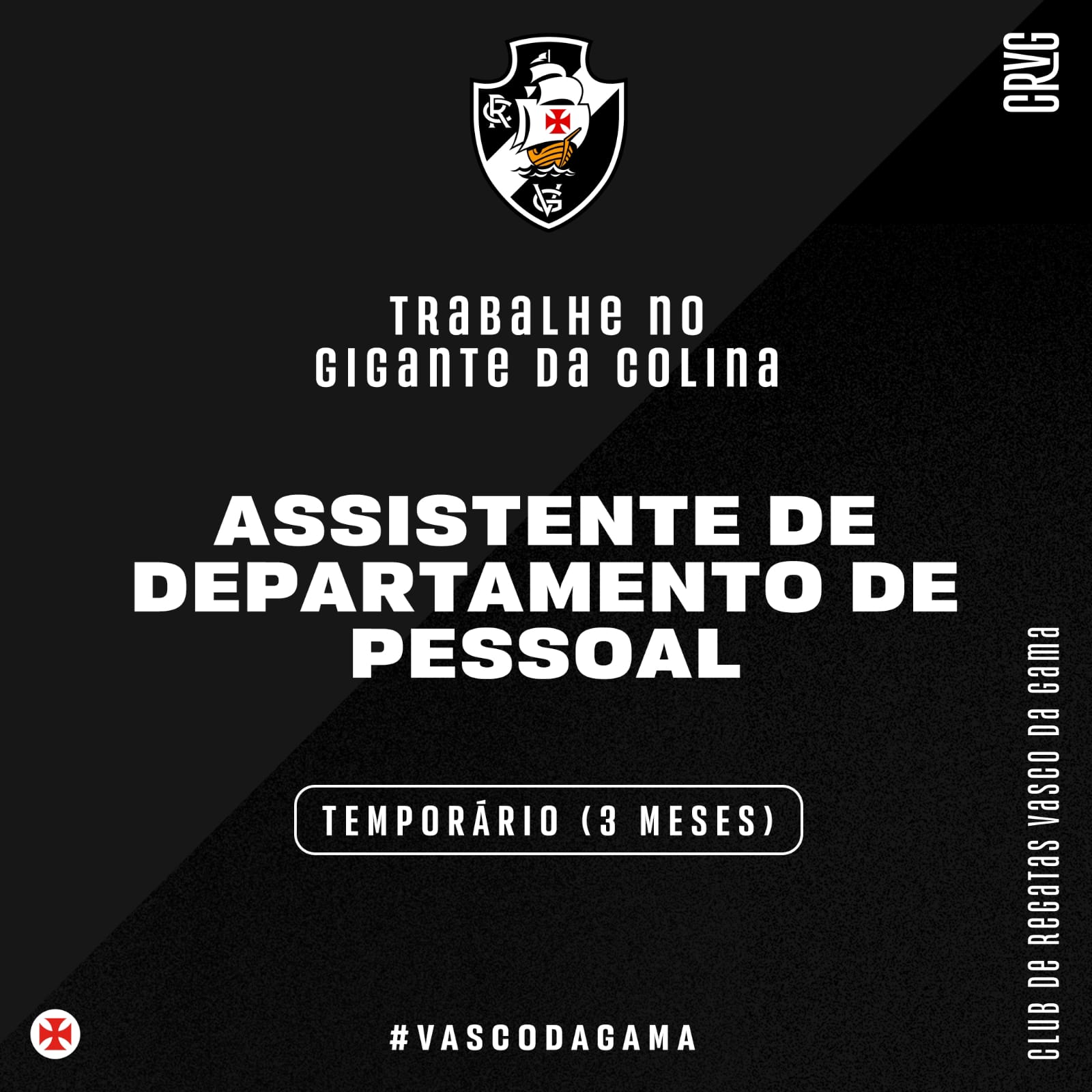 Se você gosta de desafios e que fazer parte da nossa história, veja a vaga em aberto caso você tenha o perfil que buscamos, envie um email com seu currículo para trabalheconosco@crvascodagama.com e coloque como assunto: ASSISTENTE DE DEPARTAMENTO DE PESSOAL
