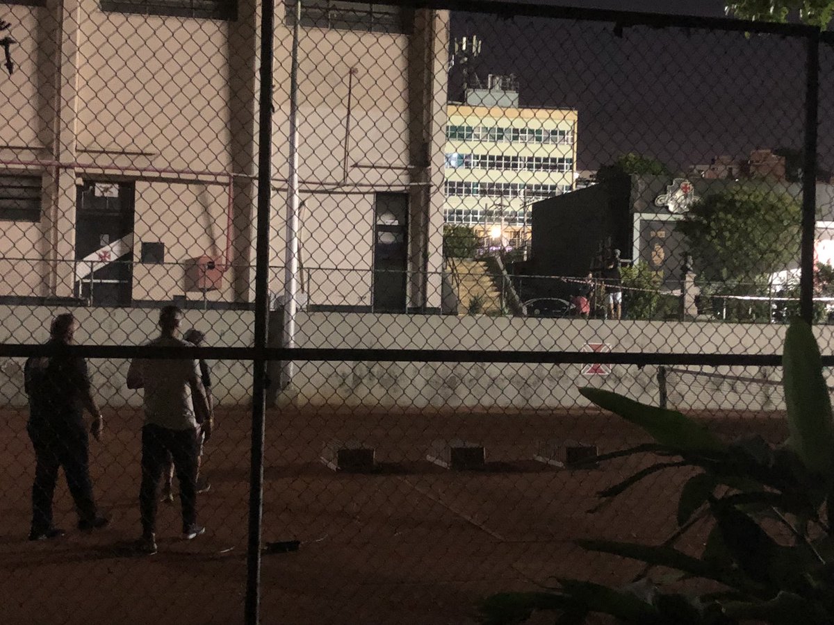 Funcionários do Vasco preparam fogos para a entrada do time em campo na quadra de tênis, ao lado da capela do clube #trcolina