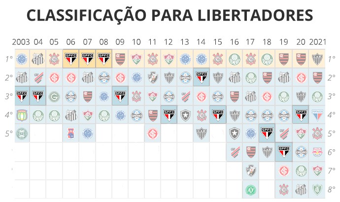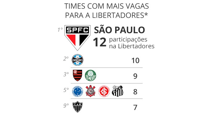 *Participações quando terminou o Brasileirão na faixa de classificação para a Libertadores, mesmo que tenha conquistado vaga por outras competições
