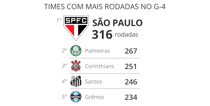O Corinthians foi o clube mais vezes campeão nos pontos corridos, com quatro conquistas, e o que ficou mais rodadas na liderança. Já o São Paulo foi o que por mais rodadas permaneceu no G-4 e também o que mais se classificou na faixa de classificação para a Libertadores.