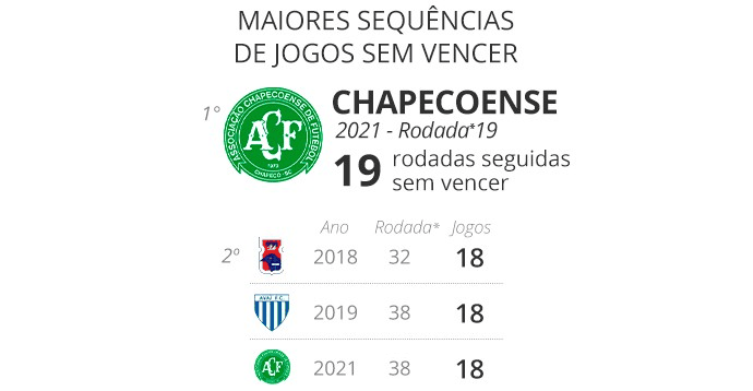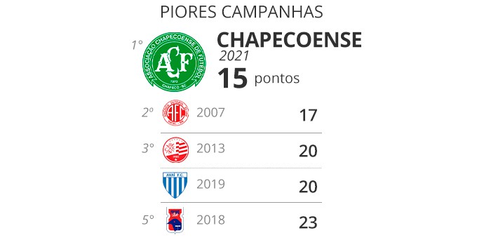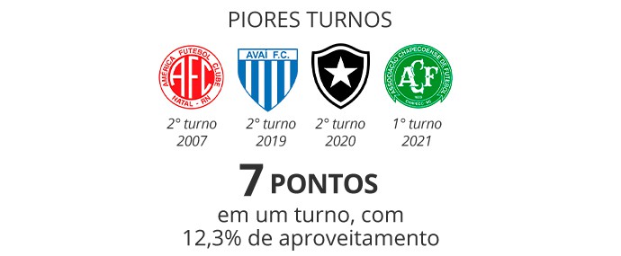 Entre os rebaixados, alguns clubes se destacaram negativamente e conseguiram péssimas marcas na competição. Em 2021, a Chapecoense teve a pior campanha desde 2003 e igualou América-RN (2007), Avaí (2019) e Botafogo (2020) com um péssimo turno no Brasileiro. Os quatro somaram apenas 7 pontos: 12% do total possível.