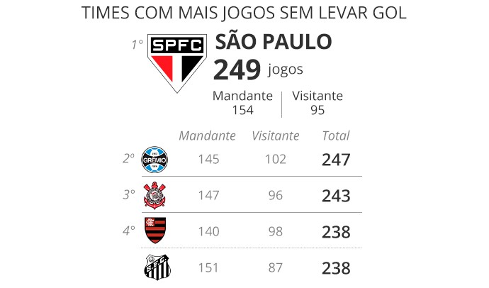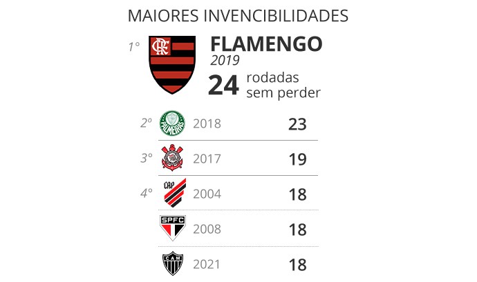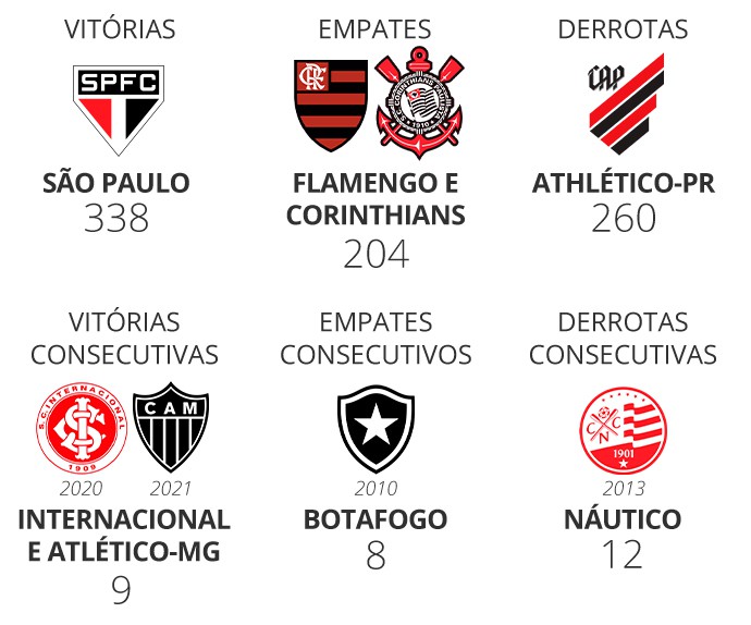 Internacional e Atlético-MG dividem o recorde de vitórias consecutivas; o Náutico foi o time que mais perdeu jogos em seguida… Maior sequência de jogos sem vencer? Chapecoense. Mais jogos sem sofrer gol? São Paulo. Time com mais gols marcados? Santos. Veja abaixo qual foi a marca obtida em cada um desses recordes e quais foram os times que mais se aproximaram de quem deixou seu nome marcado na história. É possível superá-los? Veja a diferença entre os principais destaques.