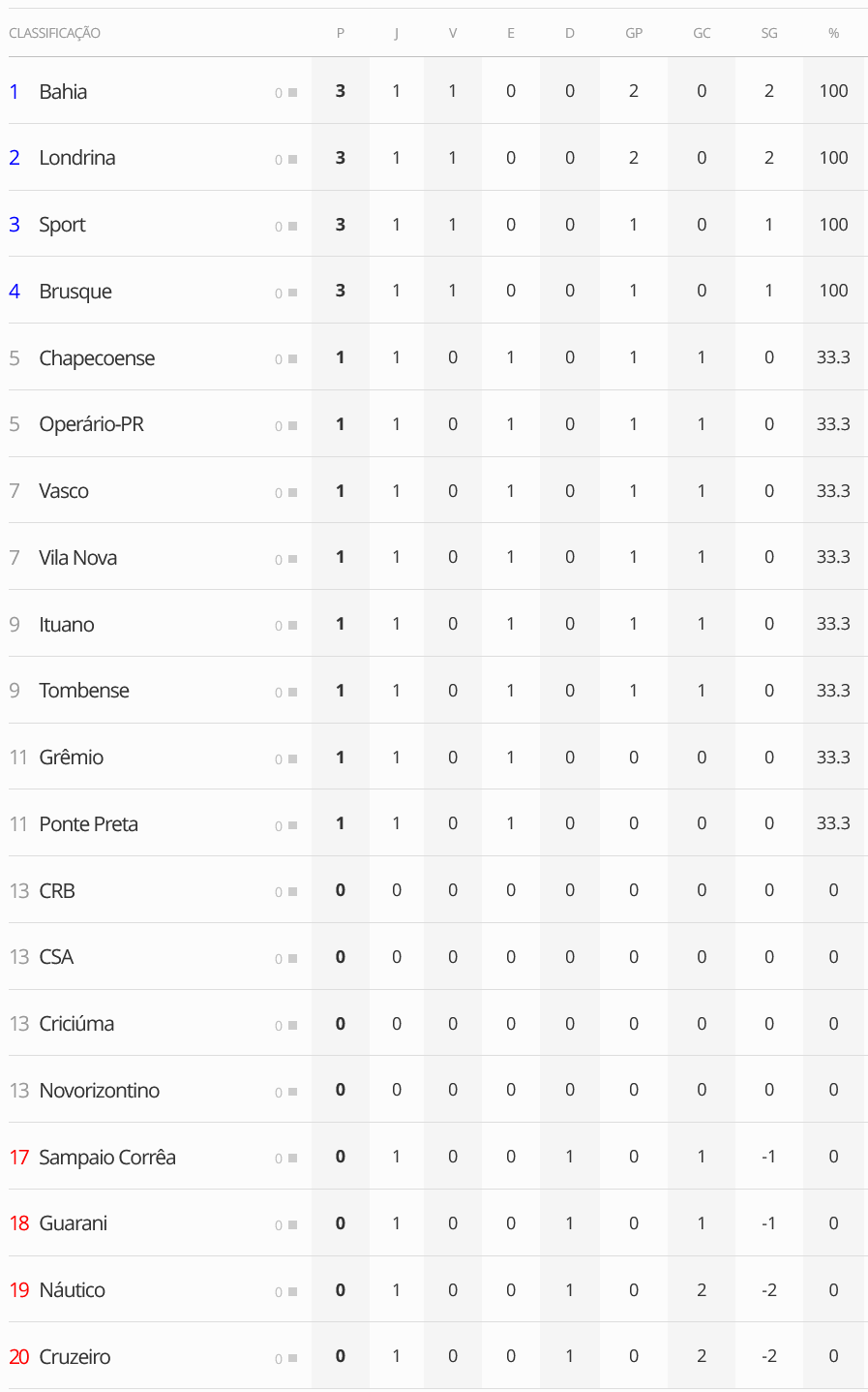 O Vasco, que empatou na última sexta-feira com o Vila Nova por 1 a 1 em São Januário, terminará a 1ª rodada do Campeonato Brasileiro da Série B fora do G4. Com 1 ponto, o Gigante da Colina é o 7º colocado.