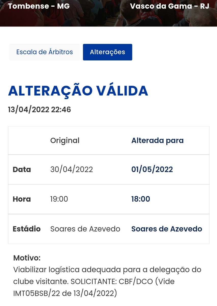 A partida entre Tombense e Vasco, que estava marcada para 30/04 (sábado, 18h), foi remarcada para 01/05 (domingo, 18h). A partida acontece em Muriaé.