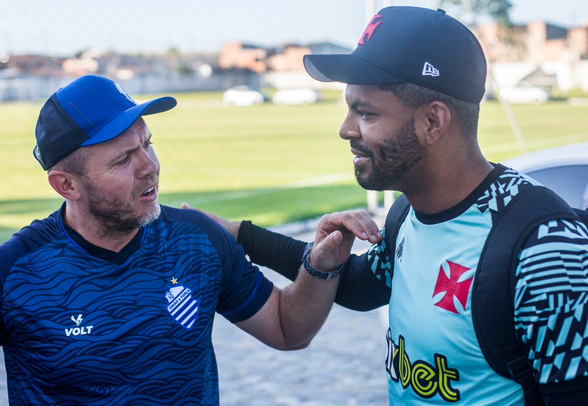 Thiago Rodrigues reencontrando o ex-técnico Mozart, que trabalhou com ele no CSA. Além dele, também viu alguns de seus colegas do clube.