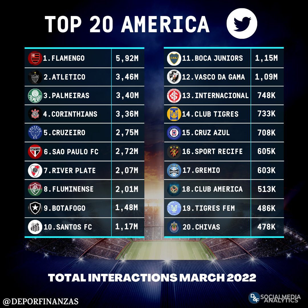 📲⚽¡Los 20 clubes de América con más interacciones en #twitter durante marzo 2022!🔃💙💬