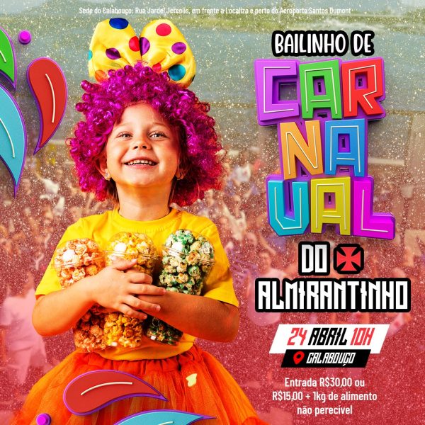 E não para por aí. No domingo, dia 24, tem o Baile do Almirantinho, às 10h, para sacudir a criançada. Os foliões mais animados vão ganhar presentes.
