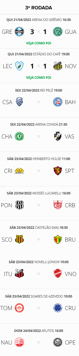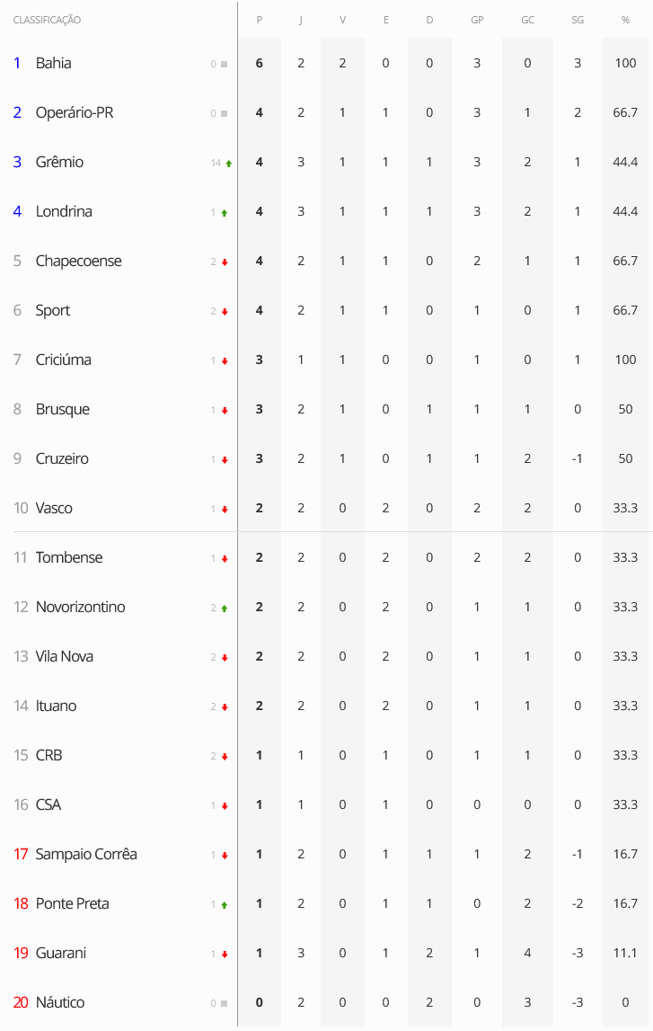 Oa resultados da abertura da 3ª rodada do Brasileiro da Série B, nesta 5ª-feira, empurraram o Vasco para a 10ª colocação. O Gigante da Colina terá a chance de se recuperar nesta 6ª-feira, às 21h30, quando enfrenta a Chapecoense em Chapecó.