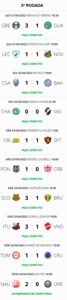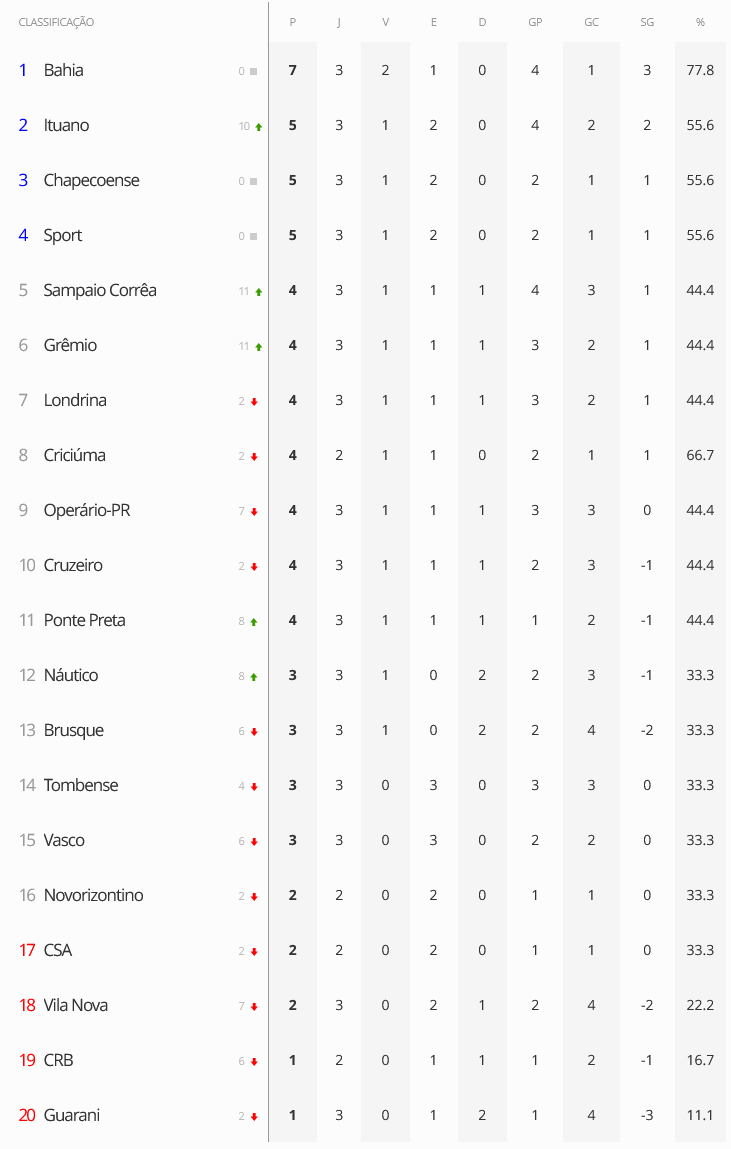 Terminada a 3ª rodada do Brasileiro da Série B, o Vasco, que empatou com a Chapecoense por 0 a 0, está na 15ª colocação.