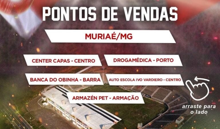 Esses são os pontos de vendas dos ingressos para a partida diante do Vasco, no domingo, em Muriaé.