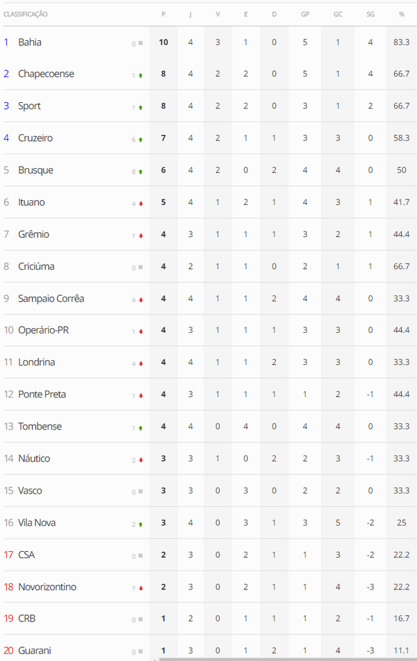 Após os jogos desta terça-feira da 4ª rodada do Brasileiro da Série B, o Vasco segue na 15ª colocação.