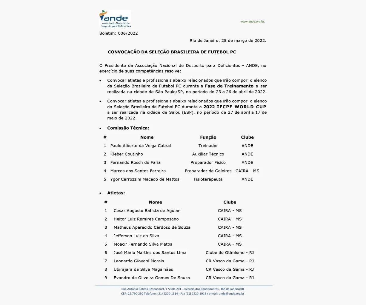 Futebol Paralímpico: Com 4 vascaínos, Brasil embarca para a Espanha para a disputa da Copa do Mundo