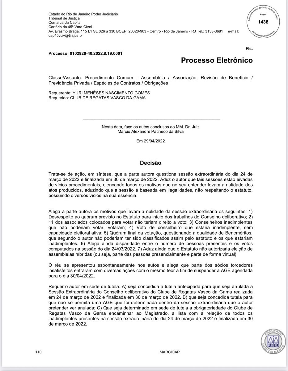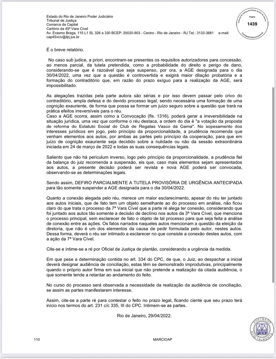 Eis a decisão do juiz Marcio Alexandre Pacheco da Silva suspendendo a AGE de amanhã