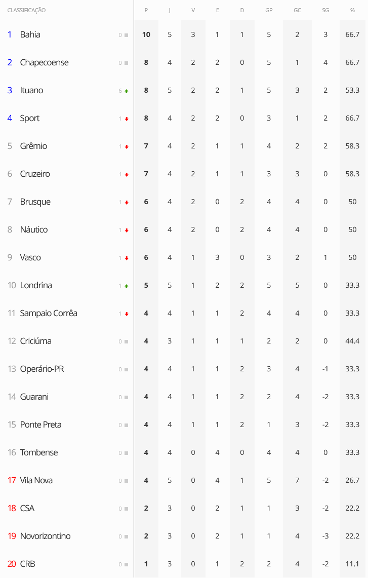Dois jogos abriram a 5ª rodada do Brasileiro da Série B nesta 6ª-feira. A vitória do Ituano sobre o líder Bahia deixou o Vasco na 9ª colocação. O Gigante da Colina enfrenta o Tombense no domingo, às 18h, em Muriaé.