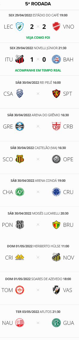 Jogos de 6ª-feira da 5ª rodada da Série B deixam o Vasco na 9ª colocação