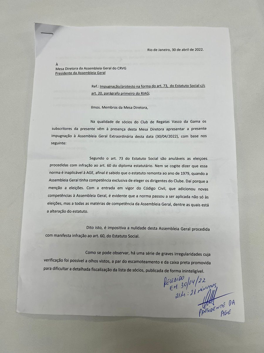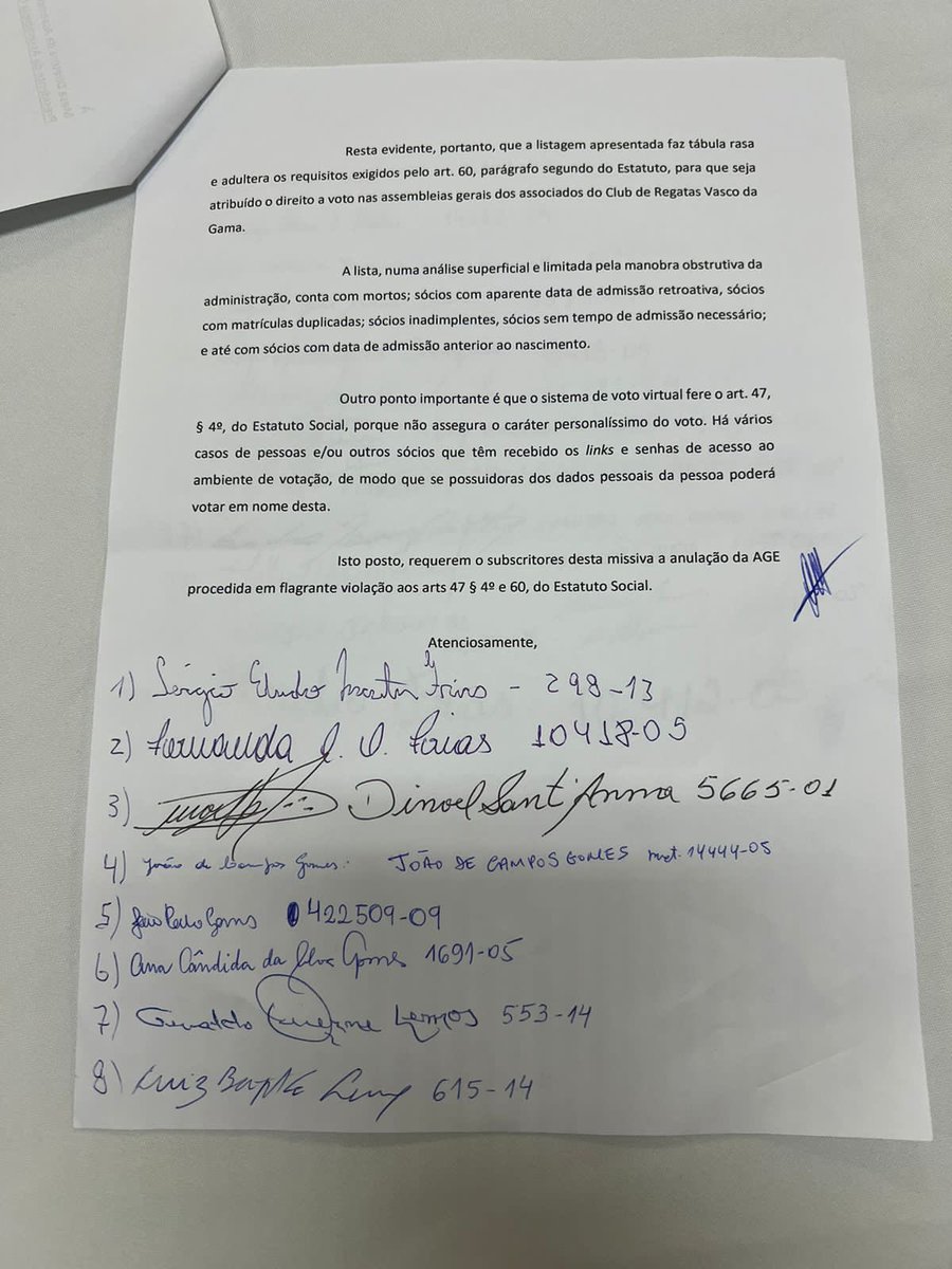 Sérgio Frias e outros 19 sócios do Vasco assinaram um documento pedindo a nulidade da AGE