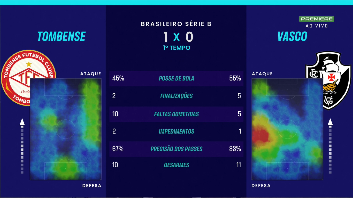 Veja os mapas de calor de Tombense e Vasco no 1º tempo