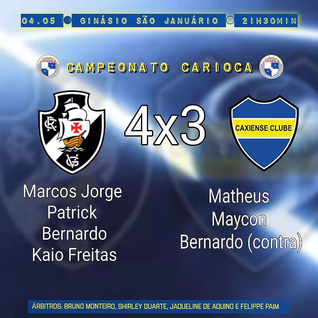 Em sua estreia no Campeonato Carioca de Futsal, o Vasco derrotou o Caxiense por 4 a 3 na noite desta 4ª-feira em São Januário. O Gigante da Colina volta a atuar no dia 12/05, 5ª-feira, contra o Maricá, fora de casa.