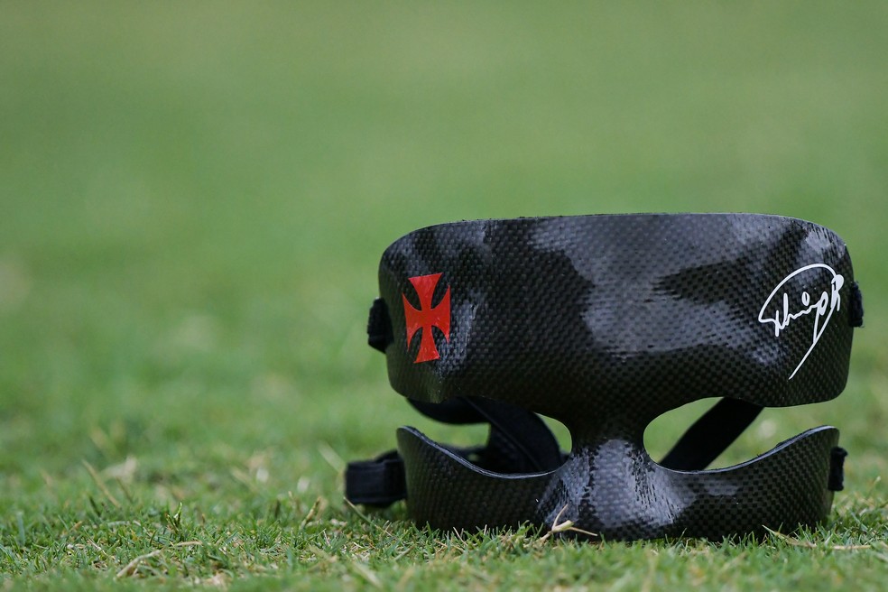 Thiago veste o mesmo aparelho protetor dos tempos de Maceió. Tirou apenas o escudo do ex-clube para colocar a cruz de malta no lado oposto de sua assinatura. No empate com o Tombense no último domingo, Thiago completou 50 jogos desde que voltou da lesão: 32 pelo CSA e 18 pelo Vasco.