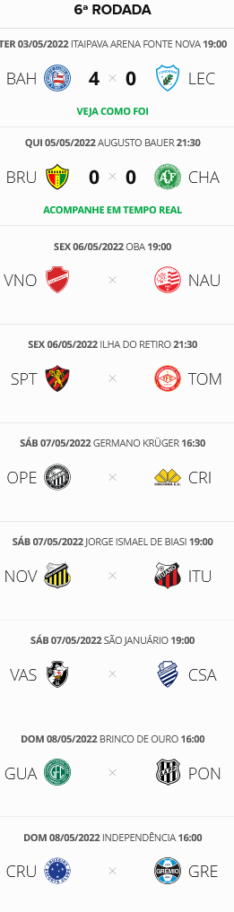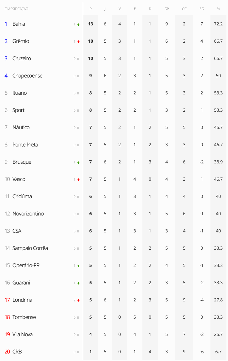 Um jogo movimentou a 6ª rodada do Brasileiro da Série B nesta 5ª-feira. O Brusque empatou por 0 a 0 em casa com a Chapecoense. Por um lado, o resultado fez o Vasco cair para a 10ª colocação. Por outro, manteve o Gigante da Colina com chance de entrar no G4 se vencer o CSA, neste sábado, às 19h, em São Januário.