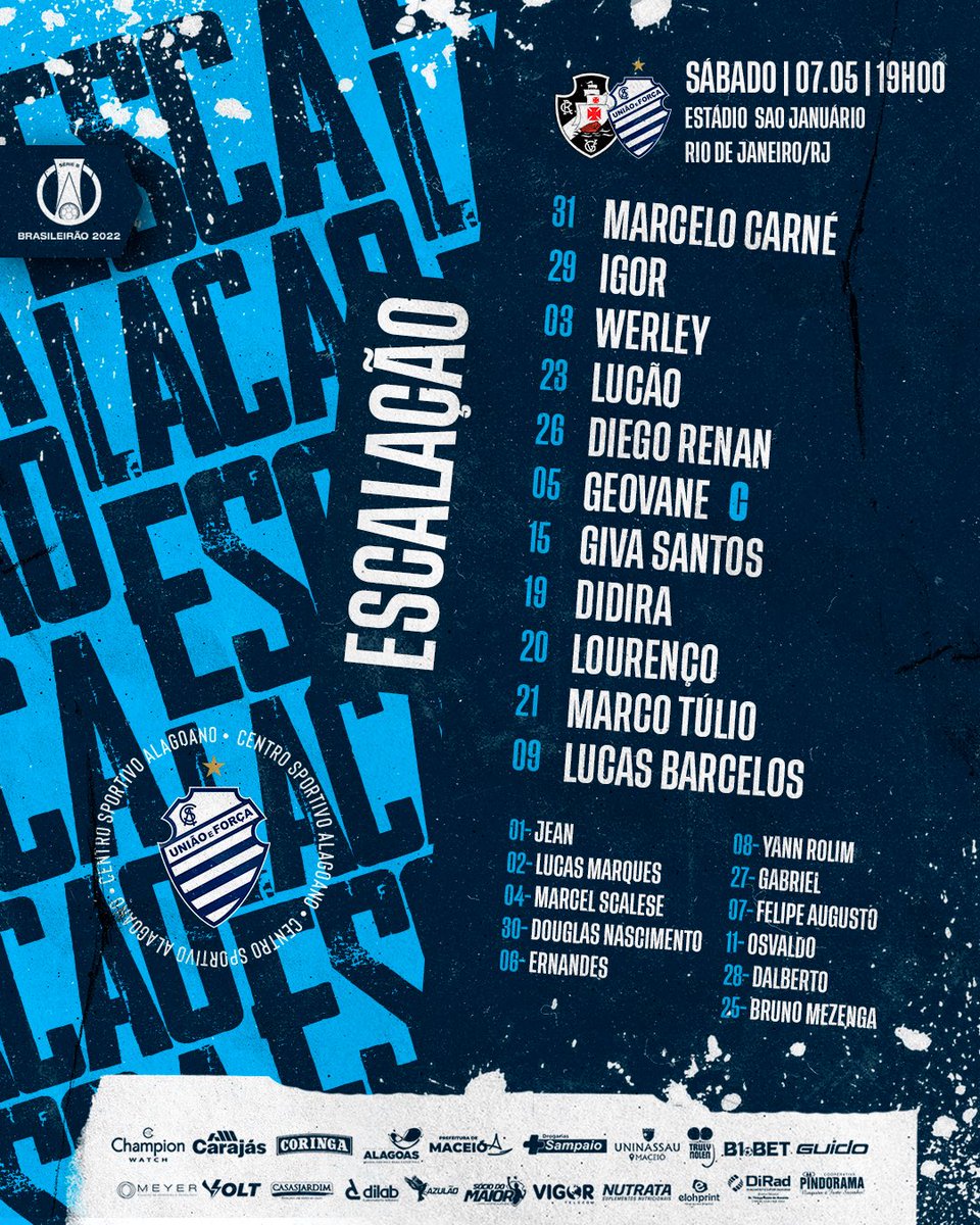 Veja a escalação do CSA para o jogo contra o Vasco; ex-vascaínos Werley e Diego Renan são titulares