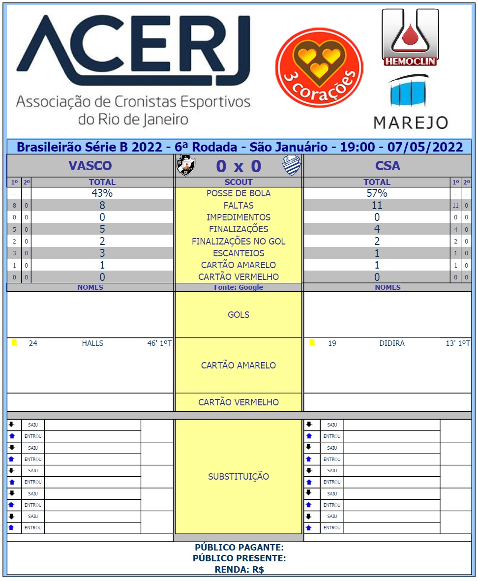 Scout do 1º Tempo de Vasco e CSA pela 6ª Rodada do Campeonato Brasileiro da Serie B 2022 em São Januário #Acerjinforma #BrasileiraoSerieB #VASxCSA #CSAoficial #Vasco @BrasileiraoB @VascodaGama @CSAoficial