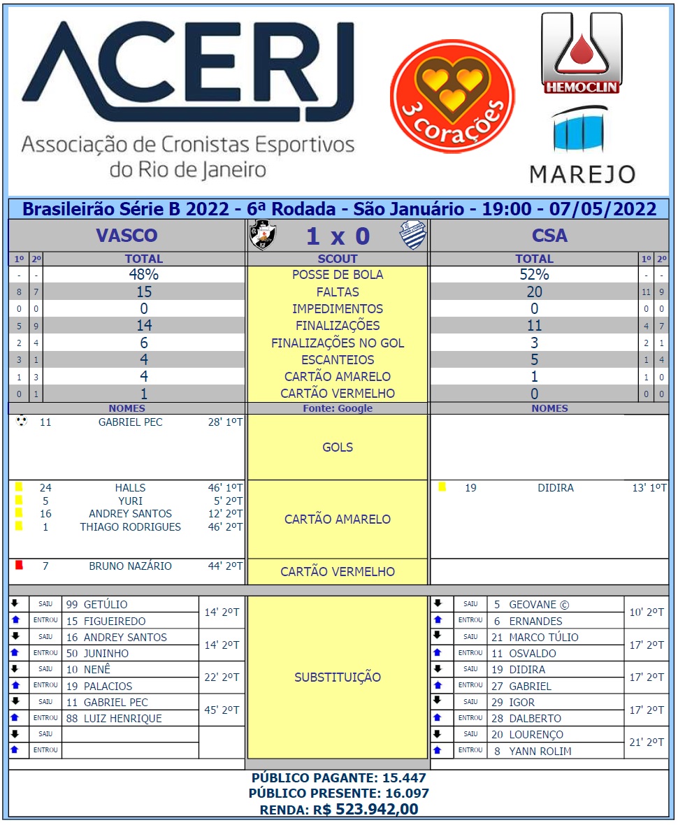 Cartões amarelos: Yuri, Halls, Thiago Rodrigues e Andrey (Vasco); Didira (CSA)