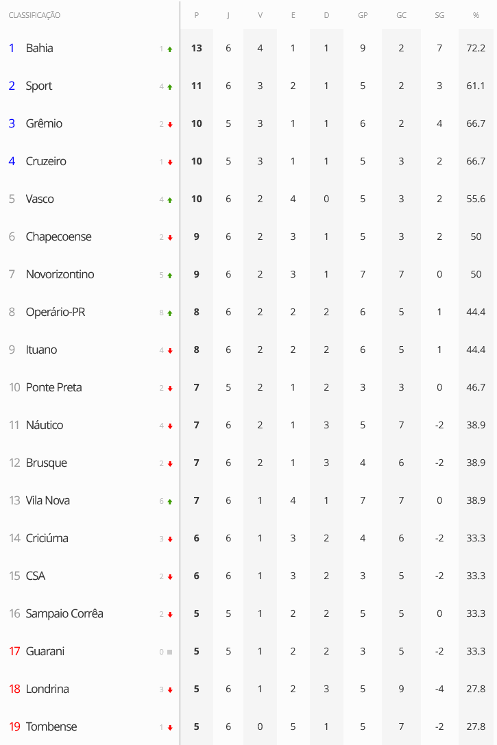Com a vitória por 1 a 0 sobre o CSA, o Vasco chegou a 10 pontos e agora está em 5º lugar no Brasileiro da Série B, com o mesmo número de pontos do Grêmio, 3º colocado, e do Cruzeiro, 4º colocado, que se enfrentam no domingo. O Gigante da Colina só terminará a rodada em 6º lugar caso a Ponte Preta derrote o Guarani, em jogo marcado também para o domingo.
