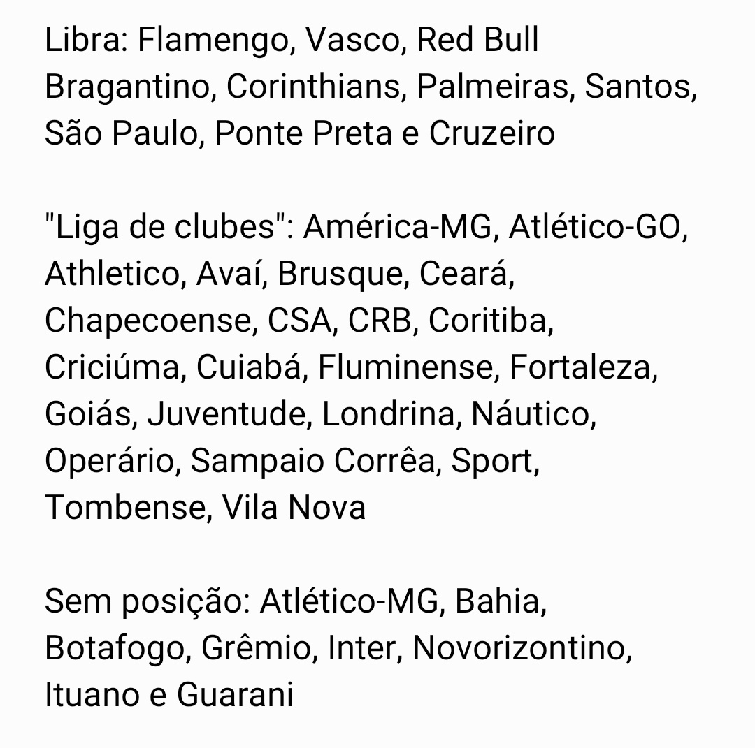 Por enquanto está assim a divisão das discussões sobre a criação de uma liga de futebol no Brasil entre os clubes das Séries A e B. 9 clubes na Libra, 23 na 'Liga de Clubes' e 8 ainda sem posição (ao menos, publicamente).
