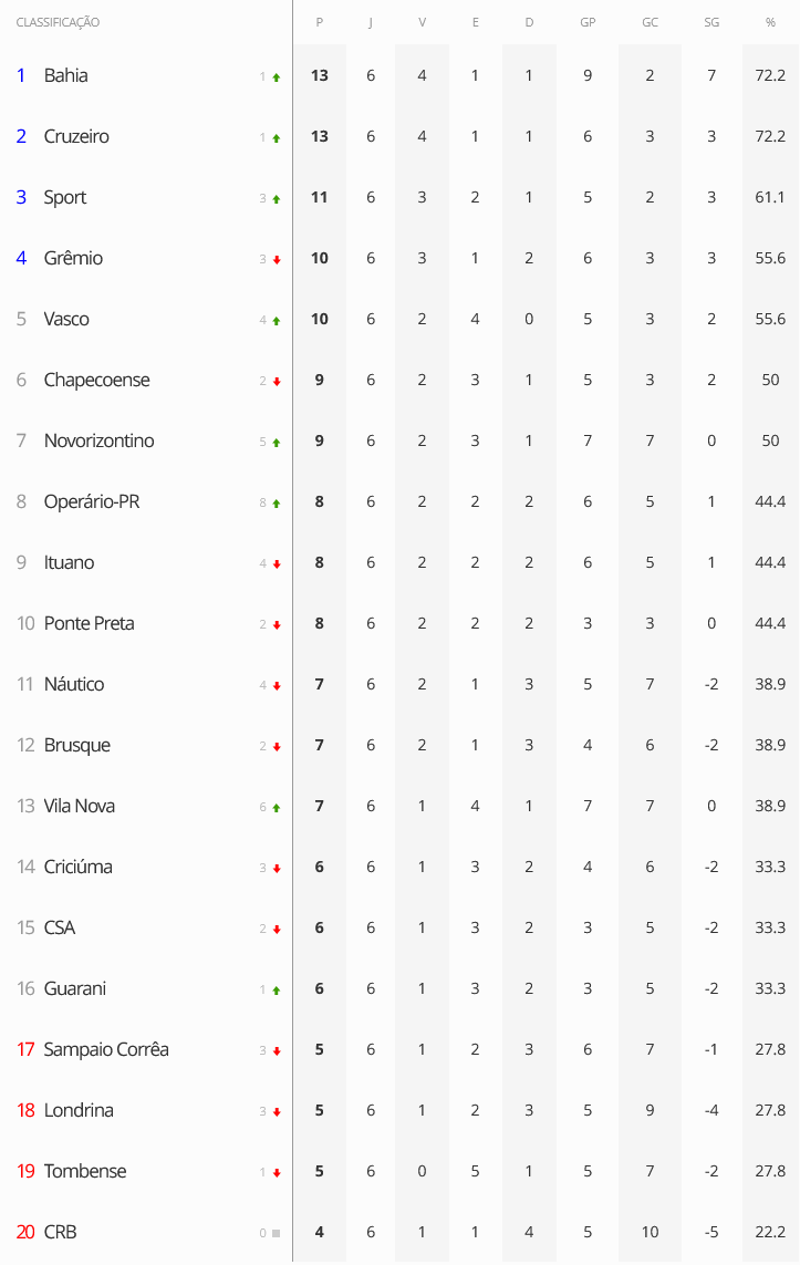 Terminada a 6ª rodada do Brasileiro da Série B, o Vasco, que derrotou o CSA por 1 a 0, está na 5ª colocação, com o mesmo número de pontos do 4ª colocado.