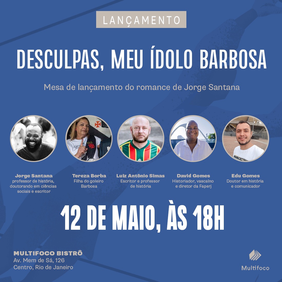 Na quinta será o lançamento do meu primeiro livro. A mesa de lançamento de peso terá @edugomes_sport historiador do futebol, @deregomesrio vascaíno e historiador, @simas_luiz escritor e professor de história e a grande Tereza Borba filha do Barbosa. Às 18h, na editora Multifoco .