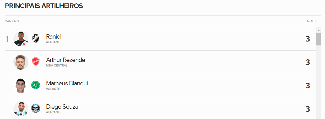 Com 3 gols marcados, Raniel divide a artilharia do Brasileiro da Série B com mais 3 jogadores, um deles o ex-vascaíno Diego Souza, do Grêmio.