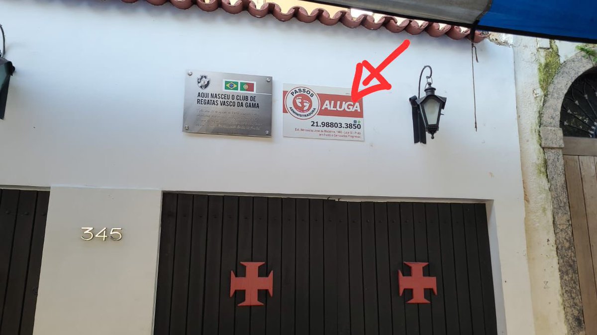 Foto de placa de 'Aluga' na fachada do Centro Cultural Candinho, local de fundação do Vasco, circula na internet
