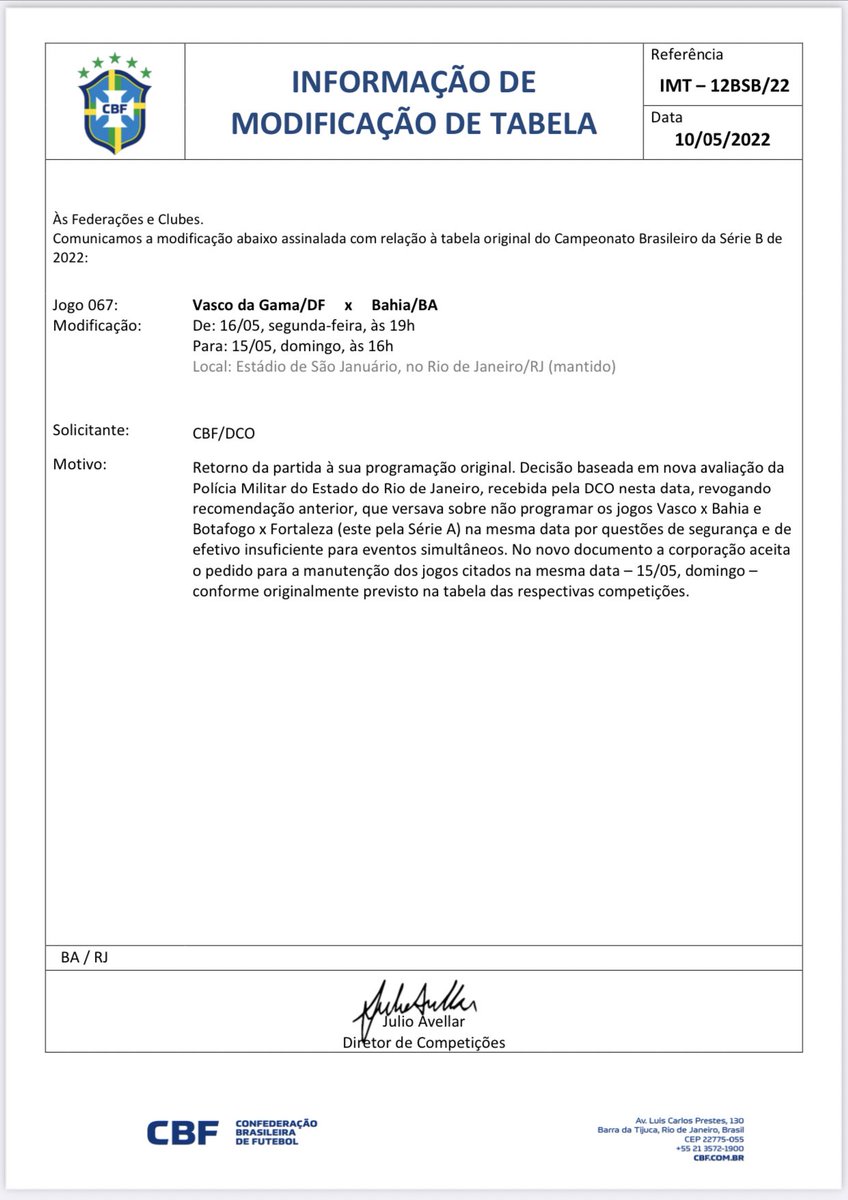 Eis aqui o documento oficial da CBF que confirma a volta do Vasco x Bahia para sua data original, no domingo (15) às 16h