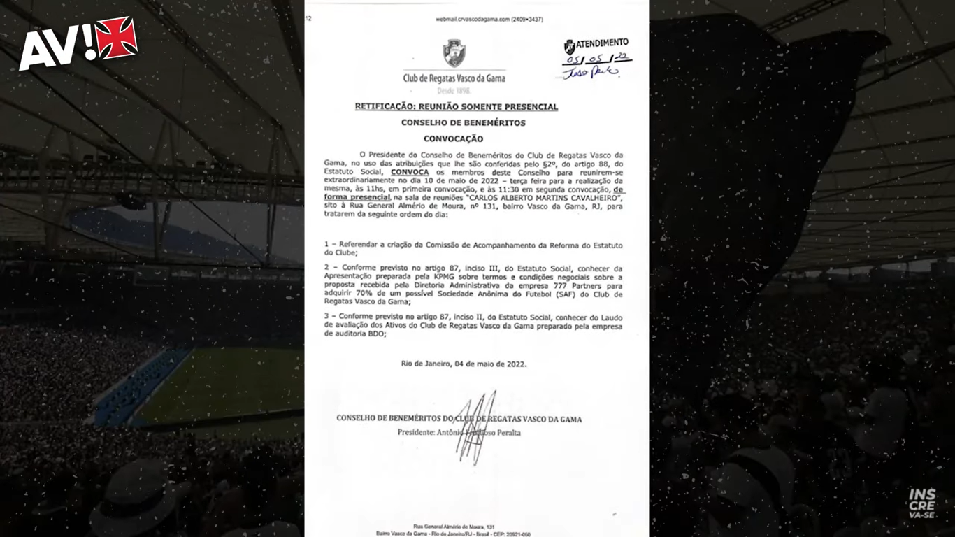 De acordo com o canal Atenção Vascaínos, a reunião presencial convocada para esta 3ª-feira por Antônio Peralta, presidente do Conselho de Beneméritos, para a apresentação da auditoria KPMG sobre a proposta da 777 Partners contou com 48 beneméritos, incluindo Sérgio Frias, do Casaca, e Eurico Brandão Miranda, o Euriquinho, filho de Eurico Miranda, que são contrários à SAF. Ainda segundo o canal, a reunião ocorreu em alto nível e foi proveitosa. Veja no vídeo abaixo.