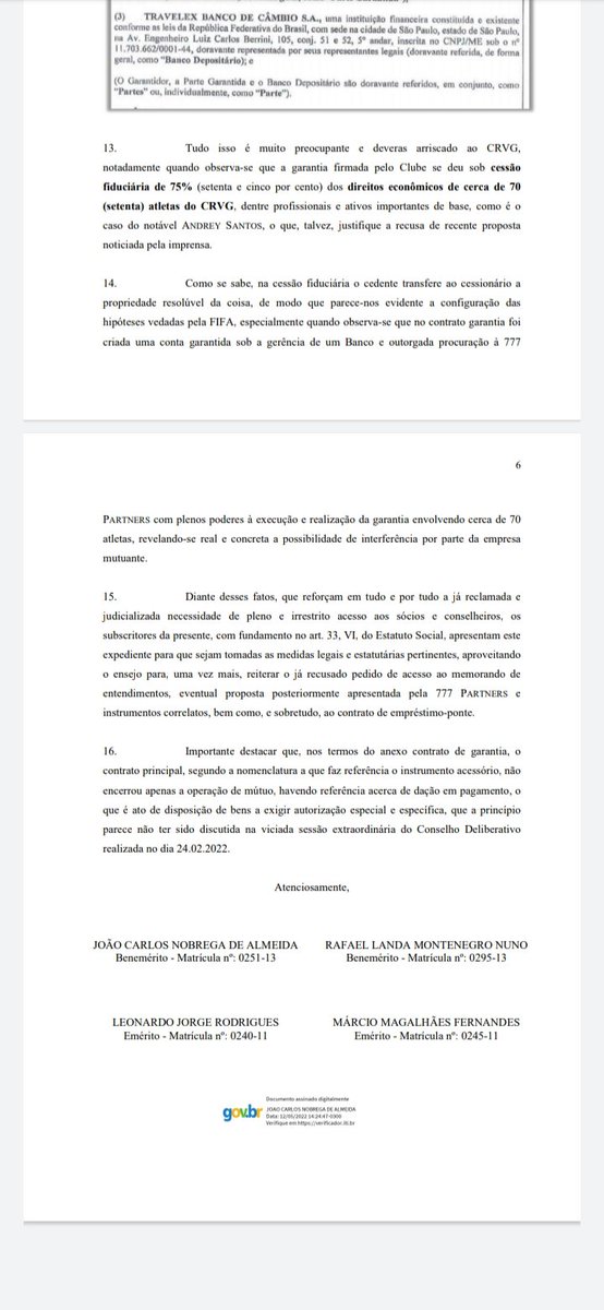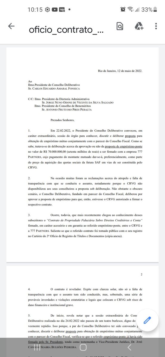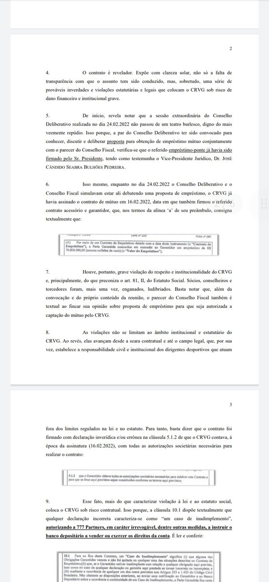 Veja a íntegra do questionamento enviado por sócios e beneméritos ao Vasco sobre o empréstimo da 777 Partners