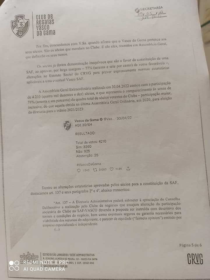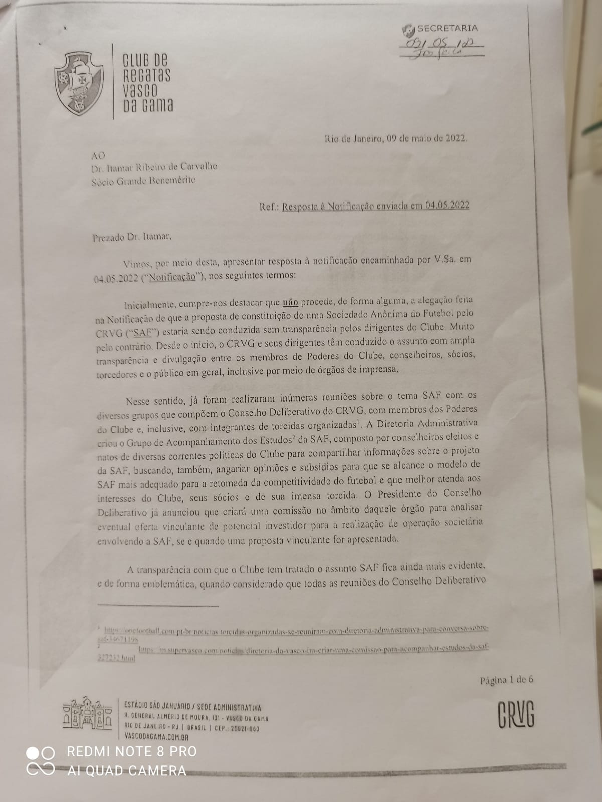 Grande benemérito Itamar Carvalho faz questionamentos ao Vasco sobre a 777 e clube responde